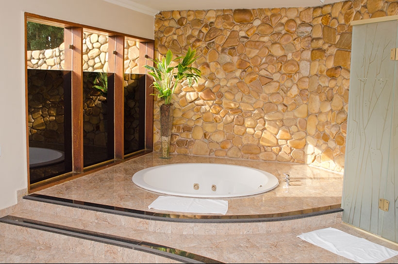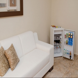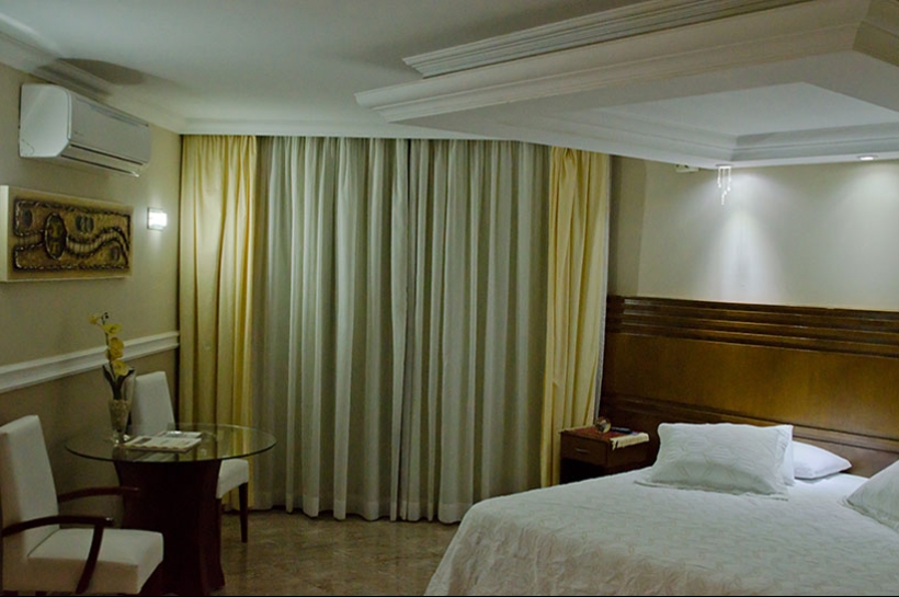 Cama super king size vibratória, poltrona de massagem, escritório, closet, banheira de hidromassagem, área para fumantes, TV a cabo, ar condicionado quente e frio e frigobar.