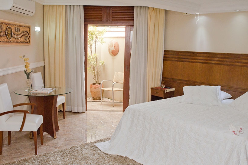 Ambiente completo, garagem privativa, área externa do complexo do hotel e ar condicionado.