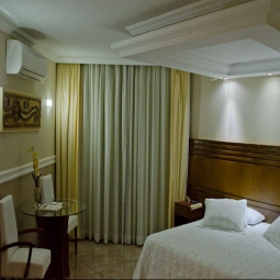 As camas separam, duas cadeiras, uma mesa, TV a cabo, ar condicionado quente e frio e frigobar.